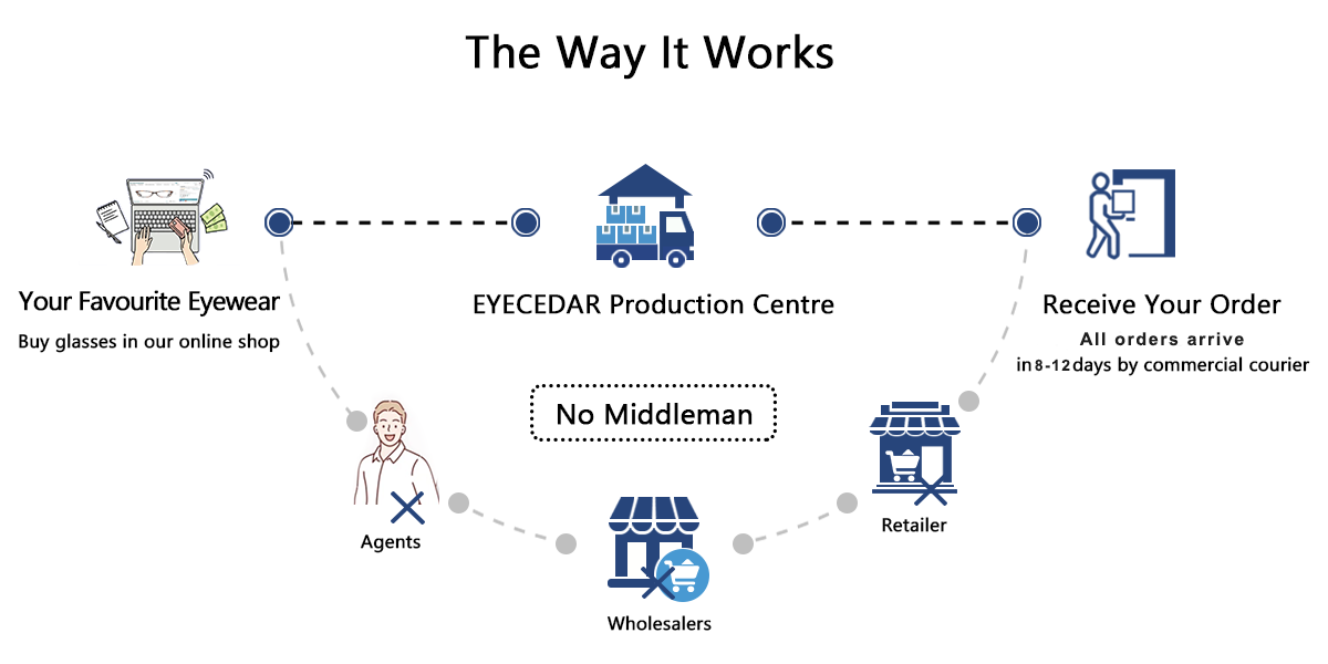 Operamos eliminando distribuidores y minoristas y enviando directamente a usted desde la planta de fabricación, eliminando muchos de los gastos tradicionales, y estos ahorros de hasta el 65% se transmiten directamente a nuestros clientes, dándole las mismas gafas que en su tienda local a una fracción del precio.